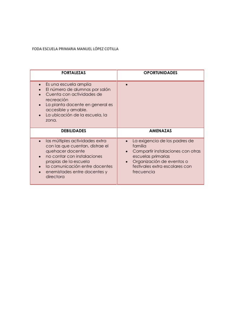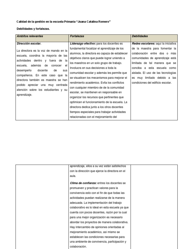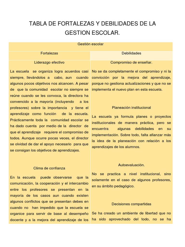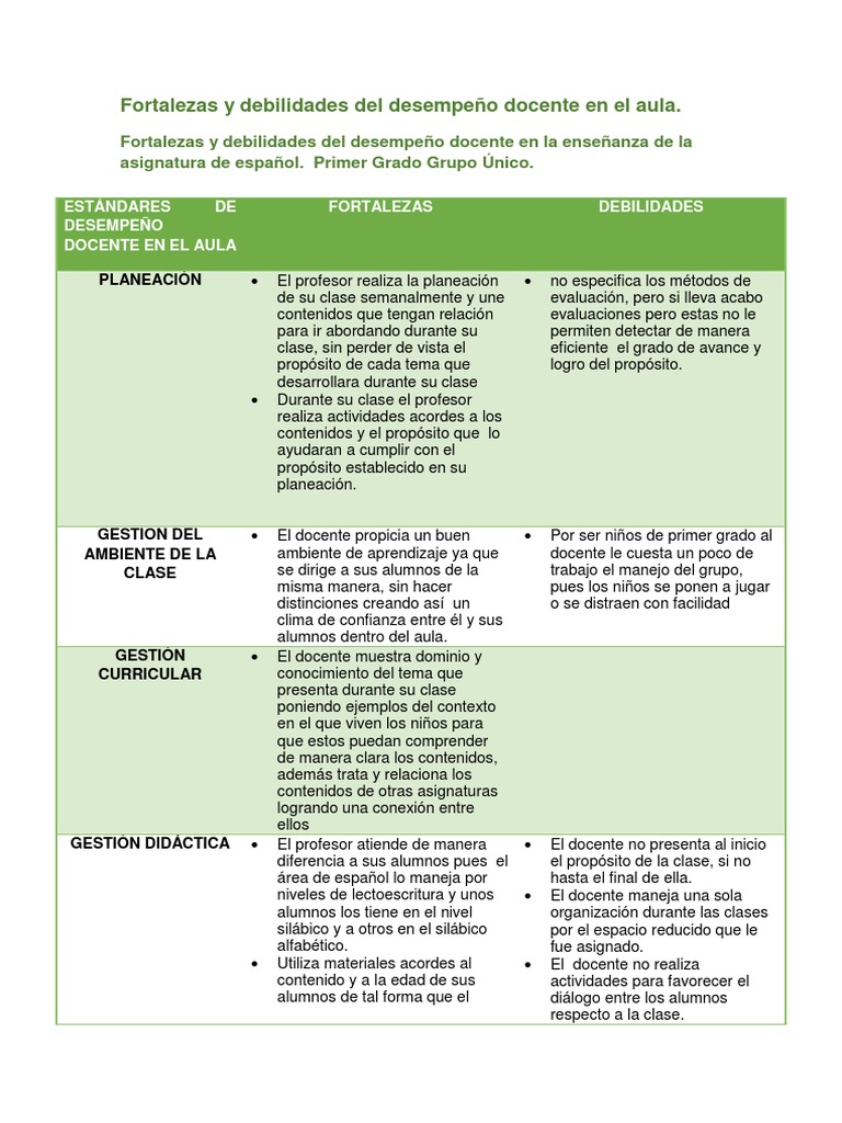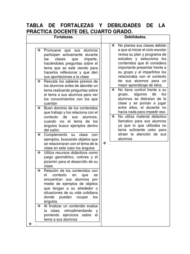 Dentro de las fortalezas de un buen colectivo docente está el poder comunicarse de forma efectiva asertiva gran parte de su quehacer educativo se basa en los procesos comunicativos que los docentes establecen con sus estudiantes y demás actores del sistema educativo. Muchos lo ignoran pero las debilidades de una persona y sus inseguridades inician desde niños. Administrador blog Varios Niños 2019 también recopila imágenes relacionadas con alumno fortalezas y debilidades de un niño de preescolar se detalla a continuación. Dentro del grupo se cuenta con una alumna de integracin educativa ya que presenta discapacidad para caminar una vlvula en su cabeza as como una sonda para drenar su. 24-jun-2016 - TABLA DE FORTALEZAS Y DEBILIDADES PRÁCTICA DOCENTE DEL CUARTO GRADO. Ver más ideas sobre fichas descriptivas por alumno rubrica de evaluacion fichas. Es hora de empezar. No sabe que les van a colocar en los exámenes o pruebas académica. FORTALEZAS Y DEBILIDADES DE LOS GRUPOS DE APRENDIZAJE COLABORATIVO EN RED.